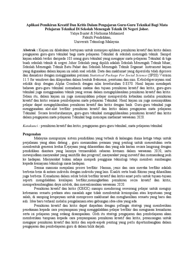 Pemikiran merupakan proses yang menggunakan akal untuk menyelesaikan masalah. Kemampuan berpikir kritis dan kreatif merupakan kemampuan yang sangat esensial untuk kehidupan, pekerjaan, dan berfungsi efektif dalam semua aspek kehidupan lainnya. Ees 2133 pemikiran kritis & kreatif tajuk tugasan : Berpikir kritis ya kritis doang. Penelitian dari sri sulistyorini (1998) yang simpulannya antara lain.